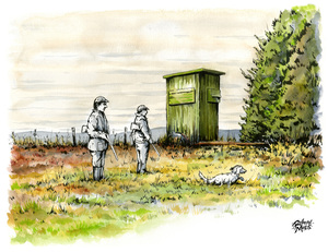 Jagers met hond tijdens jacht bij jagershut