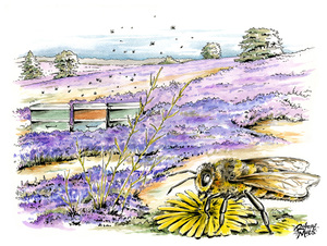 Bijenkasten en honingbij op de heide