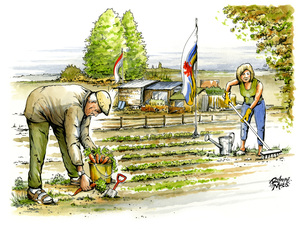 Mensen werken in volkstuin
