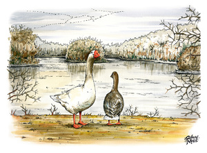 Ganzen bij vijver